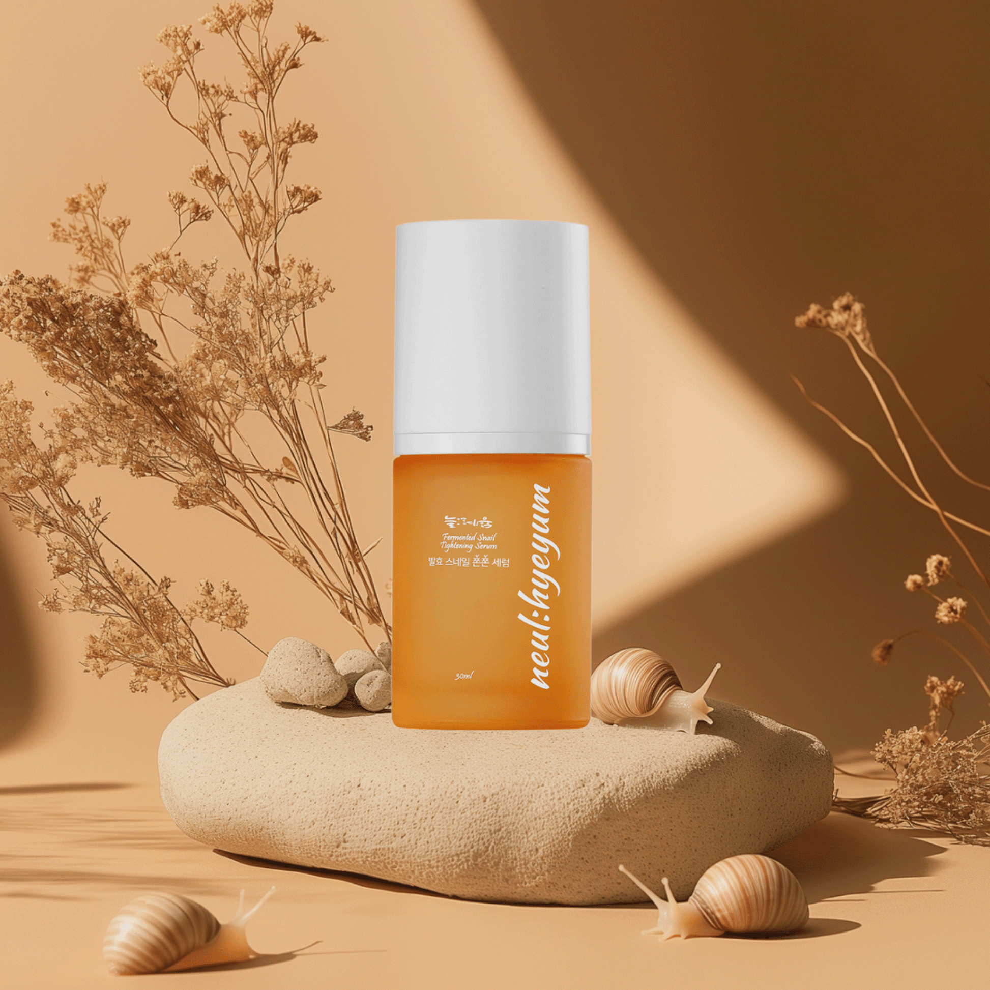 Dual-function serum with fermented snail mucin, designed to revitalize and elevate skin elasticity. Saccharomyces/snail secretion with fermented filtrate of 72.7076%. Dual-action brightening and anti-wrinkle cosmeceuticals.